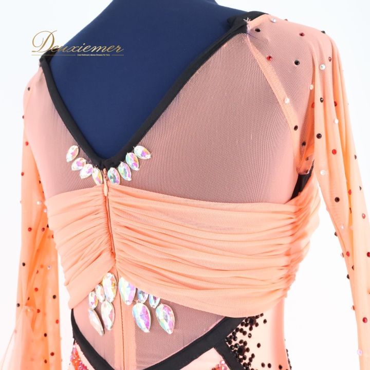 社交ダンス 衣装 ドレス ワンピース フロート デモ 競技 ダンス フリル レース ピンク系 オレンジ系 かわいい デザイン 女性らしい 明るい スカート ふんわり おしゃれ パーティー ドレスアップ 競技用 女性 Mサイズ