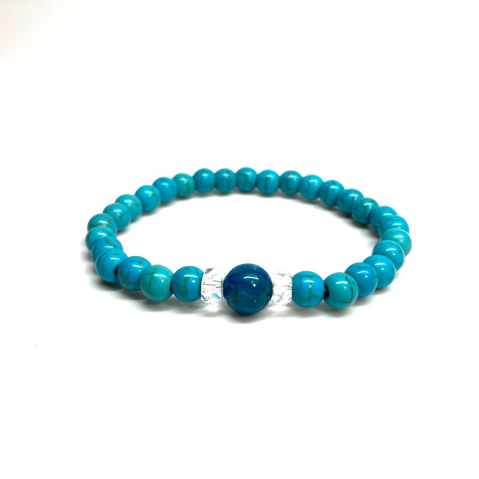 こちらは、アパタイトとターコイズを組み合わせた一粒ブレスレットです。今回はお買い得プライスにて販売しておりますので是非この機会にどうぞ。(お買い得プライスは予告なく終了する場合がありますのでお早めに!!) 石大きさ8mmと6mm玉で基本サイズは内周15cmです。(サイズ変更は1cmあたり100円で承っております。サイズ変更の場合は金額変更しますのでメッセージにてご連絡くださいませ。)プチギフトとしてプレゼントしてもいいと思います。