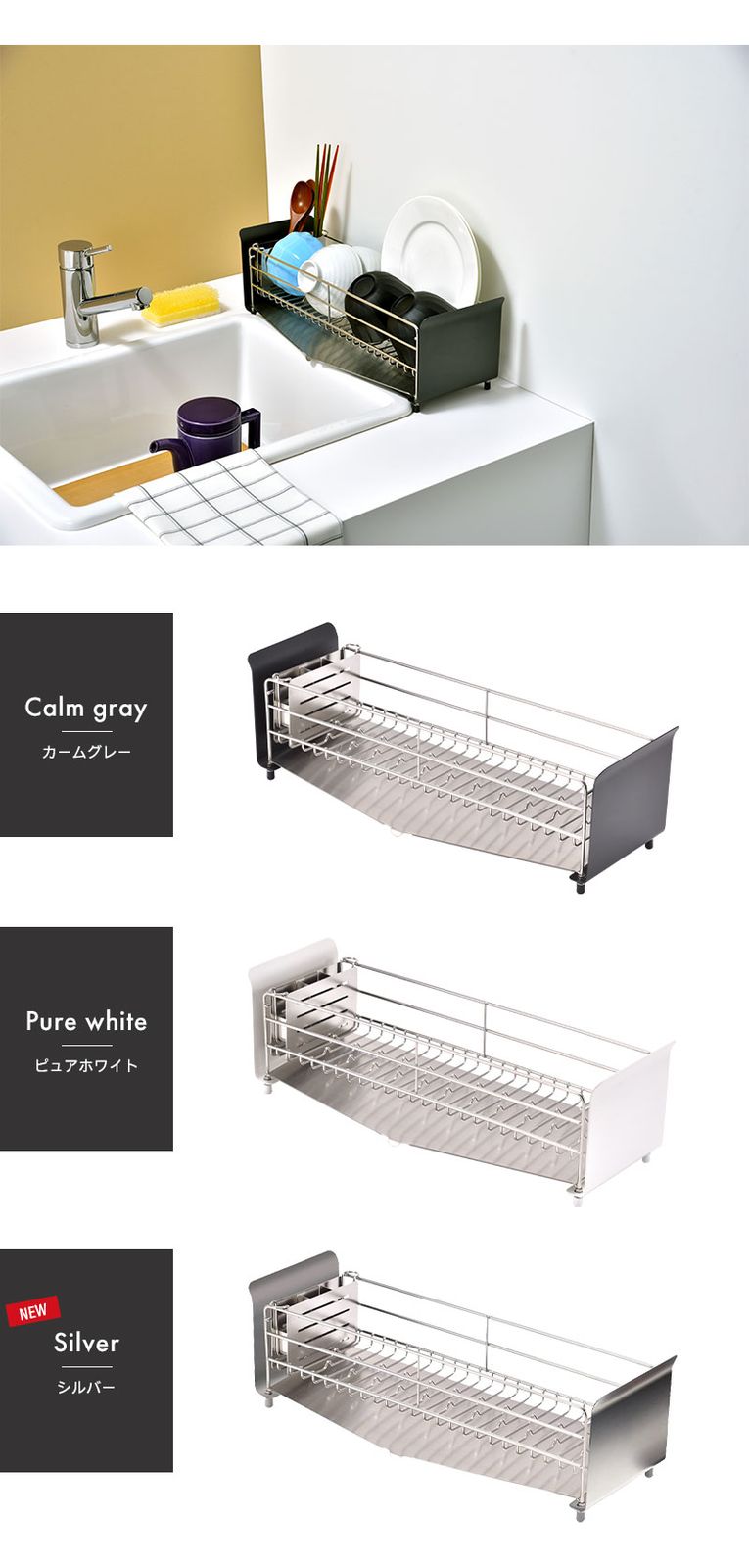 シンク横の限られたスペースに収まるスリムな水切りラック。底面には特許出願中の波型ワイヤー「たてよこウェーブ」を搭載し、食器を縦・横どちら向きでもしっかりキャッチ。食器の安定感が増し、出し入れもスムーズです。1~2人分の食器を収納できるコンパクトサイズで、食洗機を使うほどではない少量の洗い物に最適。自動で水が流れる専用トレー付きで排水の手間を省き、トレーは取り外して丸洗いできるので清潔に保てます。さらに脚部は高さ調節機能付きで、段差のある場所でも設置可能。滑り止め付きで安定感も抜群です。