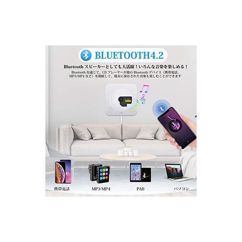 「置き&壁掛け式と新バージョンのリモコン」壁掛け式なので、付属するウォールマウントキットおよびプレートで、お部屋のどこにでも設置することができます。さらに、デスクスタンドも付属しているので、卓上に置いて使用することも可能です。新バージョンのリモコンは、旧バージョンに比べてボタンの押し心地がよく、ボタンのレイアウトが適切でより手にフィットし、認識範囲も広がりました。再生のご注意:1、CD再生する前に、CDモードに切り替えてください。2、ひび割れや変形、修復したCDディスクは使用しないでください。3、本製品はCD,CD-R,CD-RW,MP3,WMAなどのファイル対応しかできません。本製品に対応するCDディスクをご使用ください。4、CDディスクのファイルのフォーマットと完全性をご確認ください。不完全な音楽ファイルは再生できません。ご了承ください。5、CDを入れた後、約15~20秒で音が出ます。ご了承ください