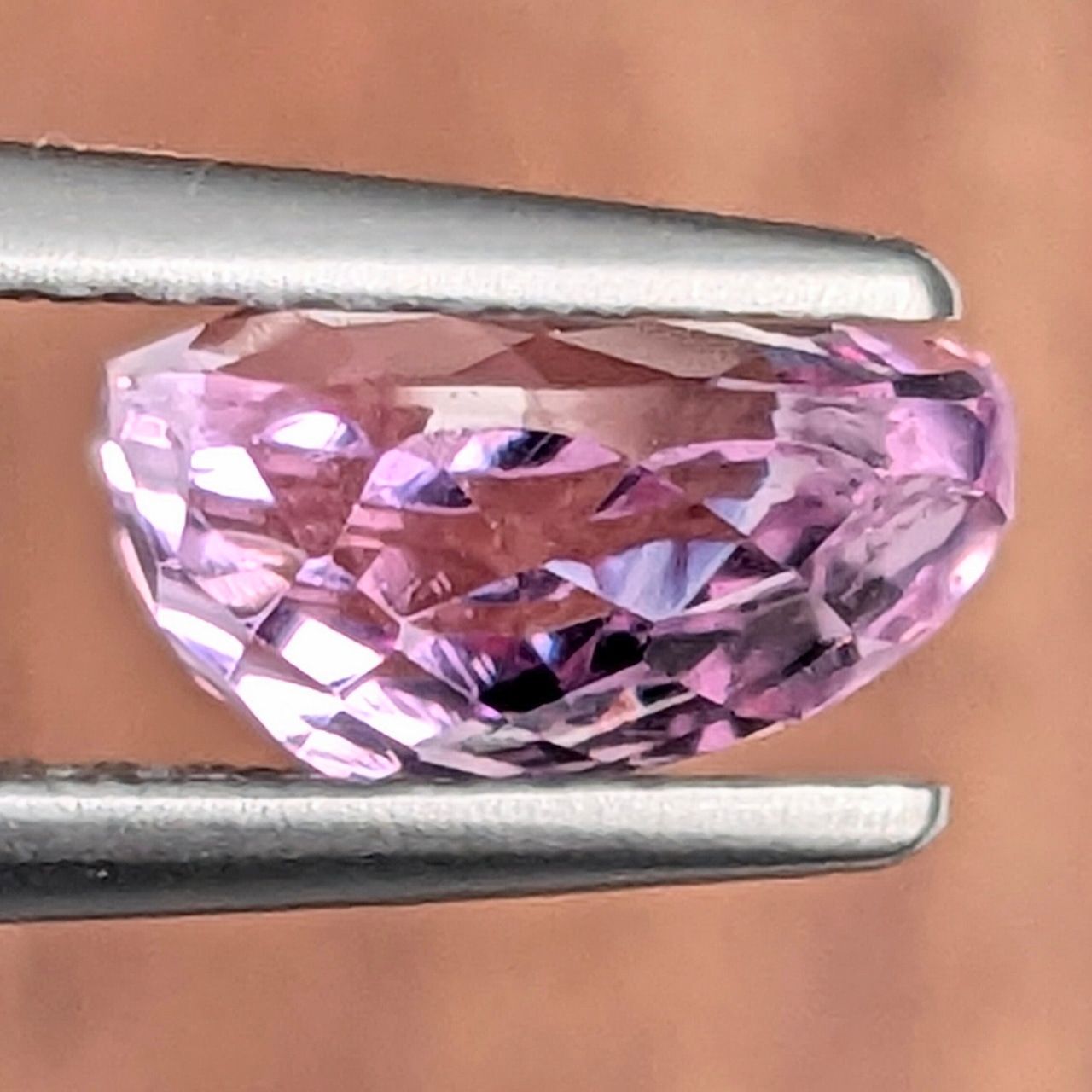 トパーズの中でも希少な「OH(水酸基)タイプ」のインペリアルトパーズ。その中でも特に人気があるのが今回の『インペリアルピンクトパーズ』です。ちょっぴりふっくらと太めのペアシェイプに、スッキリと輝くピンク色。透明度も高く、かなり上質な1ピースが入荷しました。インペリアルトパーズの特性である“トロリとした艶と輝き”が、全面からお楽しみいただけます。