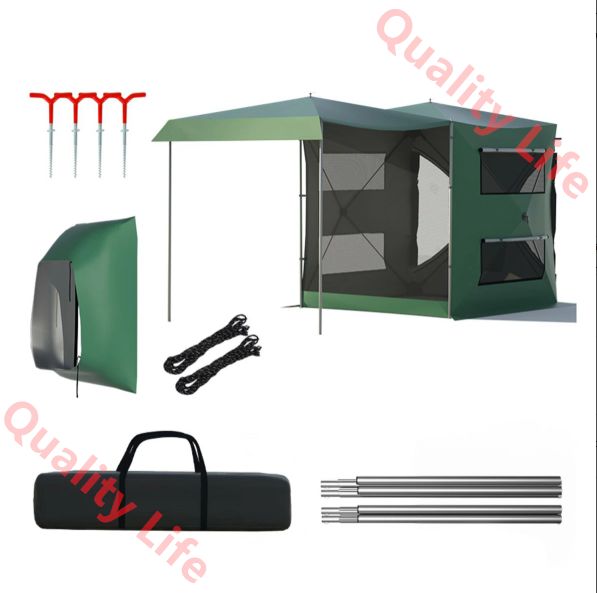 タープ テント カーサイドタープ 車用 日よけカーテント 両側に大型二重窓 内側は通気性メッシュ 通気性 設営簡単 単体使用 2~4人用 キャンプ アウトドア 公園 登山 車中泊
