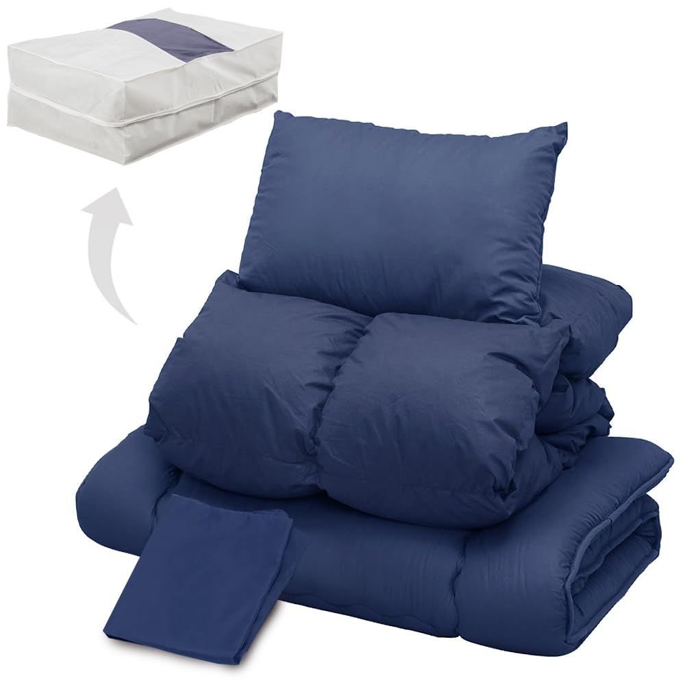 3層構造 あったか 敷布団セット ふわふわ 羽根布団 フェザー シングル ピーチスキン 5点 軽量 セット ボリュームタイプ 布団 ネイビー アイリスプラザ