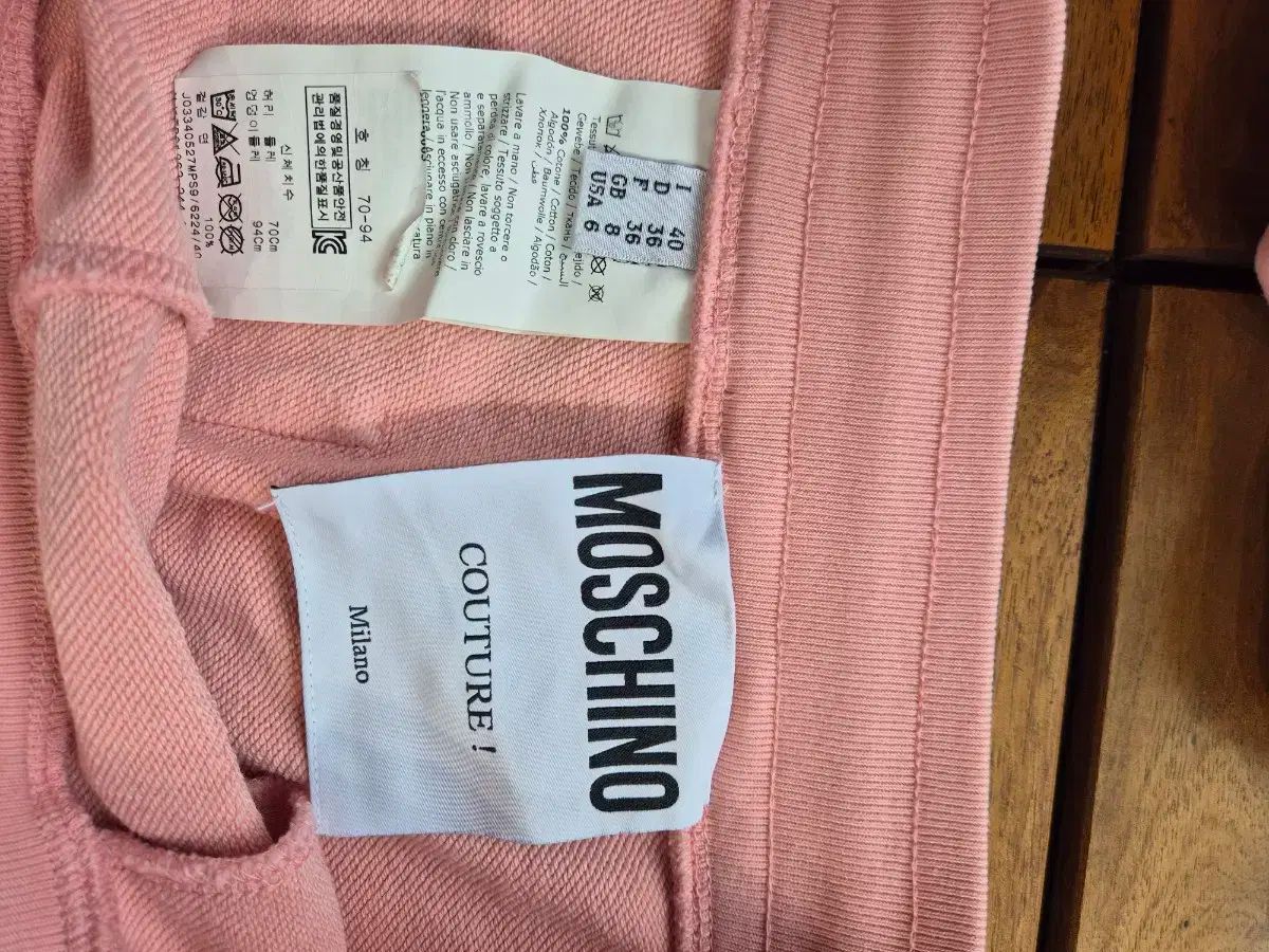 これはピンクのモスキーノトレーニングセットです。パーカーもトレーニングパンツもコットン製なので、着心地がいいです。