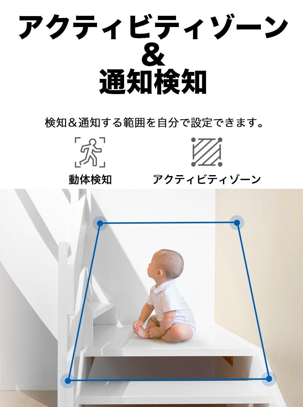 ?? 【AI検知&通知機能】 AIが人物や赤ちゃんの泣き声などを高精度に検出し、スマートフォンに即時通知。通知内容や検知条件はアプリから柔軟にカスタマイズ可能です。