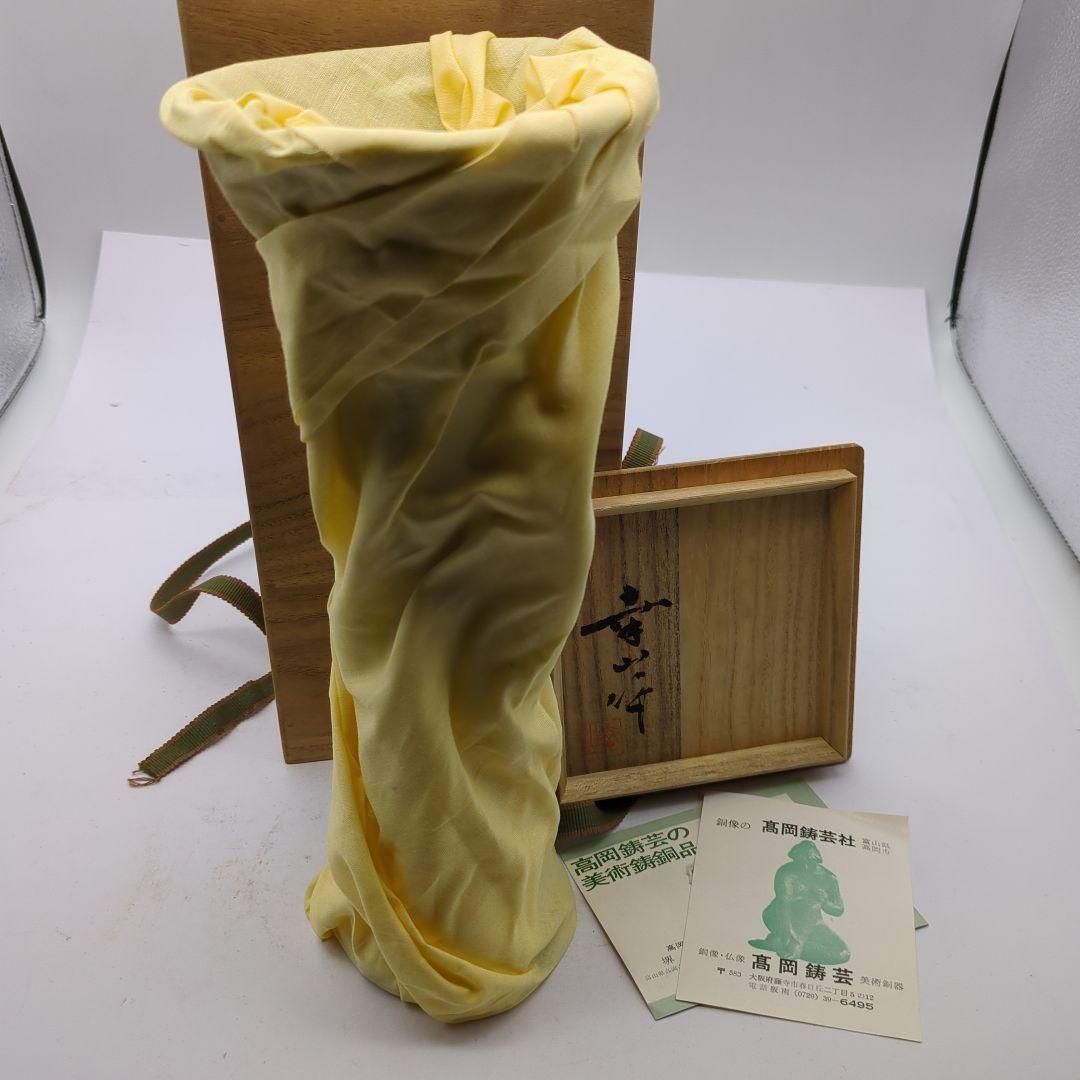 高岡銅器製の細長いフラワーベース、木箱と証明書付き。