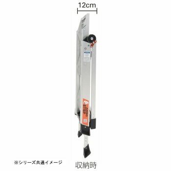 工具やスマートフォンなどが置ける便利なトレー付きです。手摺はワンタッチでセット解除ができる安全設計。大型支柱端具で安定性がアップします。棚や壁に近づいて作業できる収納もラクなコンパクト設計です。