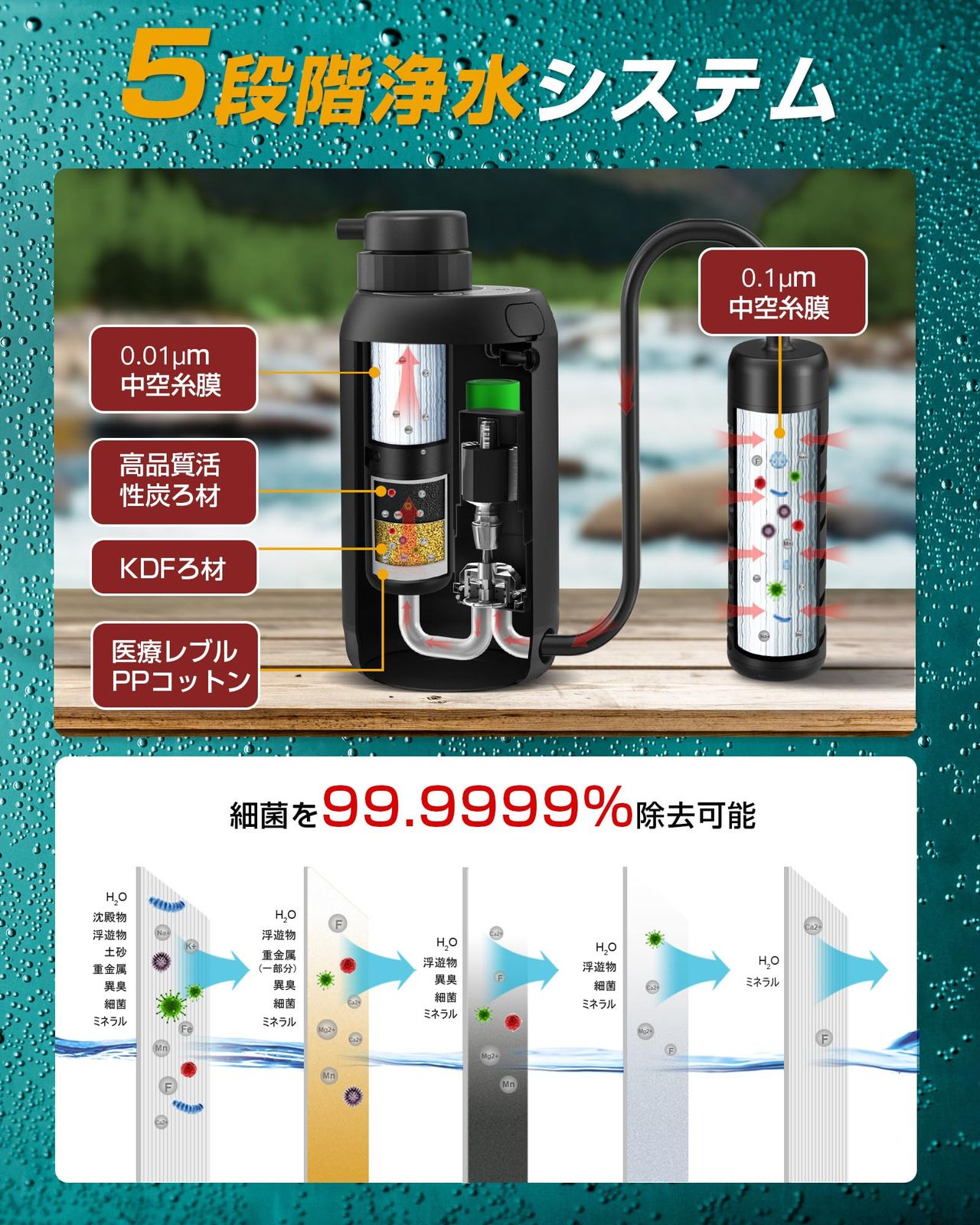 安心・安全な5段階浄水システム業界初のデュアル浄水カートリッジを採用し、5段階ろ過システムを搭載した電動式ポータブル浄水器。粒子、赤サビ、大腸菌、コレラ菌などの雑菌や原虫嚢子、沈殿物などを99.9999%除去する性能を国内水質検査機関で実証済み。交換可能な浄水カートリッジにより、いつでも清潔で美味しい水を提供します。