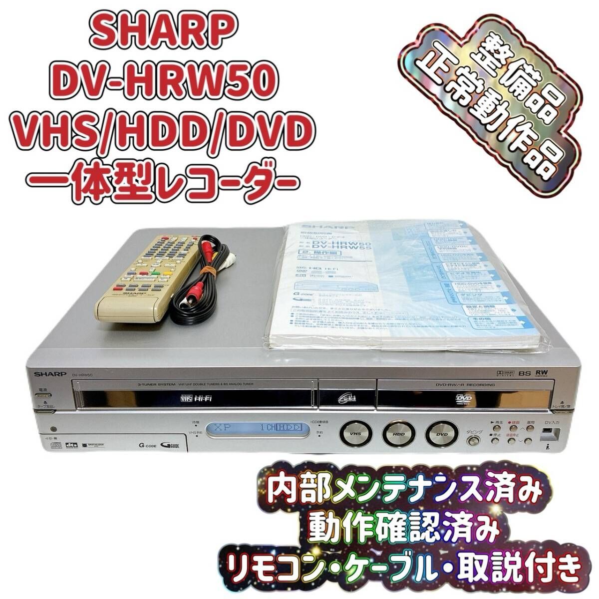 整備品 SHARP シャープ DV-HRW 50 VHS⇔DVD⇔HDD ダビングデッキ ビデオデッキ リモコン付 ケーブル付 取扱説明書付き