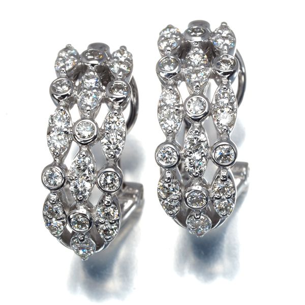 両耳で総計1.00ctもの瑞々しい透明感と繊細な輝き放つダイヤモンドを飾ったダイヤモンドピアス。ラウンドとマーキスフォルムのデザインへ飾られた表情の異なる輝きが実に美しく耳元を華やかかつエレガントに演出してくれますよ。
