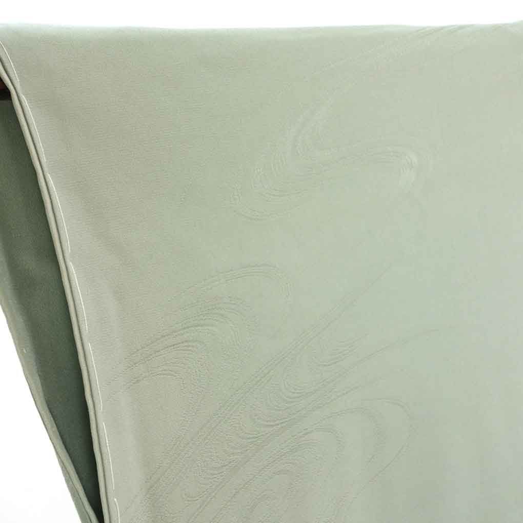 正絹のちりめん地の袷色無地です。流水の地模様の生地にグレーかかった落ち着いたグリーン地の無地で家紋は入っておりませんのでカジュアル用途にお召しいただけますが、刺繍紋を入れると法事などにもお召しいただけます。身長150cm-160cm程度、標準体型の方にお勧めサイズです。広衿仕立。裄の縫い代は3cm程度ありそうです。