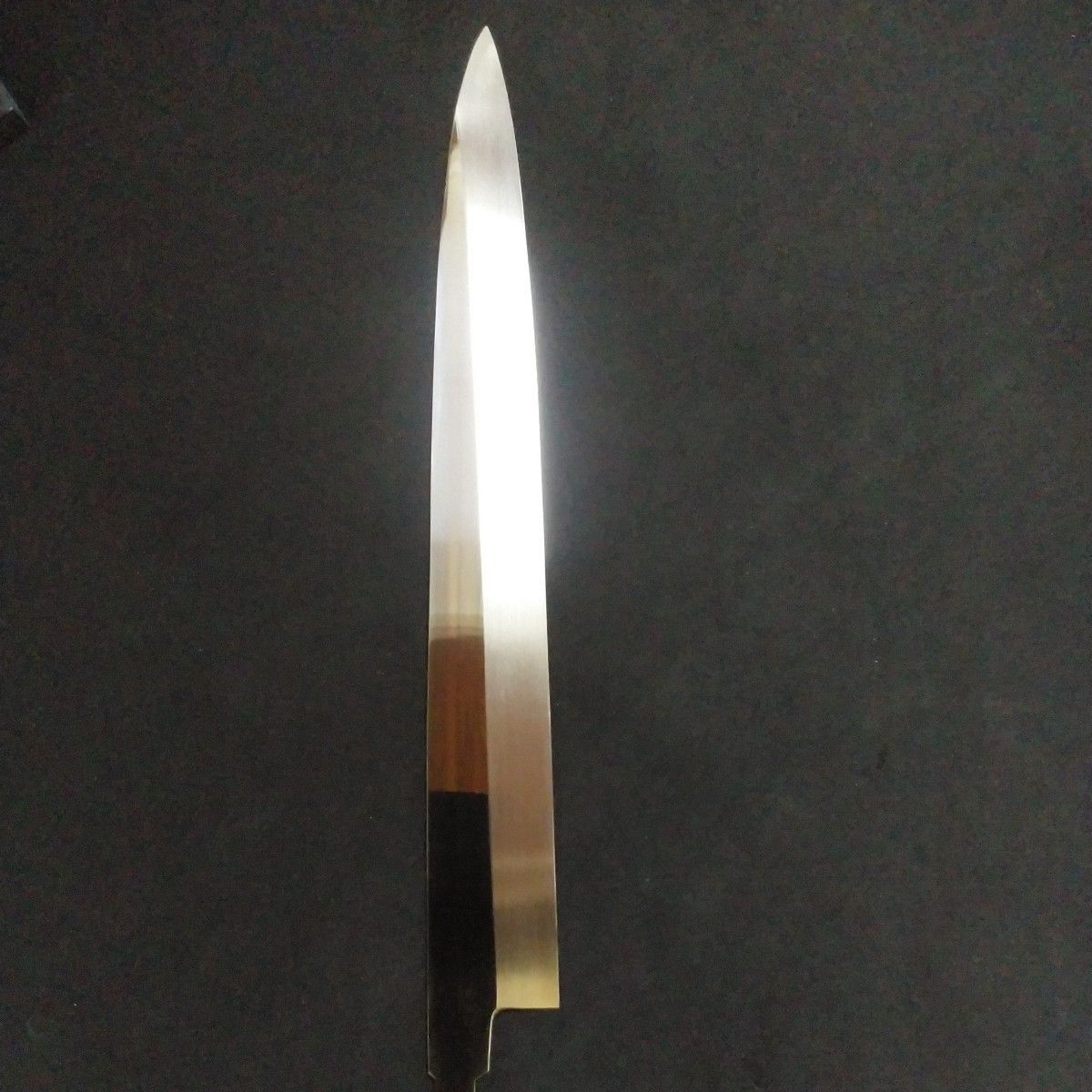 堺業務用刃物メーカー直売 尺 柳刃 超鋼スーパー本焼き セミステン 錆びにくい 片鏡面 裏城山刻印入り 黒檀上下白水牛柄