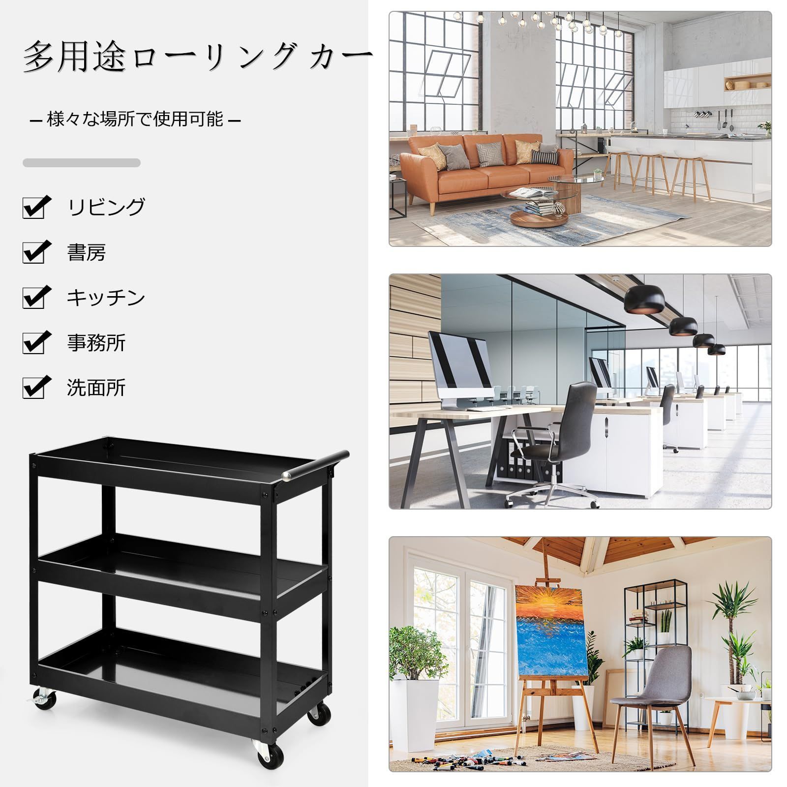 【どんな場面でも活躍】この多機能収納ラックは、家、オフィス、レストラン、ワークショップ、ガレージ、倉庫など様々な場面に適しています。また、コンパクトなサイズの頑丈なツールカートは、スペースが限られている小さなアパートに最適です。