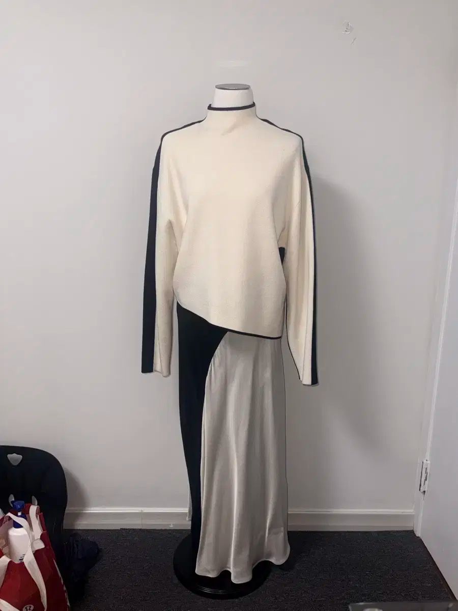 これは & Other Storiesのツートンカラーのセットアップです。アンバランスなデザインが独特で洗練された雰囲気を醸し出しています。トップスはニット素材で、スカートはロングスカート丈です。
