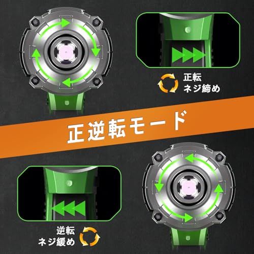 【正逆転両用&無段変速】このインパクトレンチは、柔軟な操作方法を備えています。左右の本体側面にある正逆転切り替えレバーを操作することで、回転方向を簡単に変更できます。時計回りに回転させるとネジを締め付け、反時計回りに回転させるとネジを外します。また、無段階変速機能も搭載されているため、本体のトリガーを握る強さで回転速度を調整できます。必要な作業に合わせて、正確な操作を実現できます。