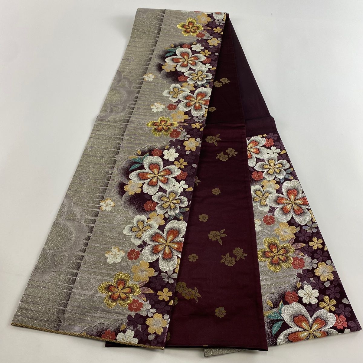 袋帯 秀品 桜 縞 箔 唐織 銀色 六通 正絹