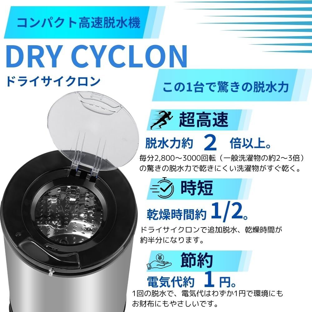 ●超高速 脱水力約2倍以上(一般洗濯機と比較) 毎分2800~3000回転(一般洗濯機の約2~3倍)の驚きの脱水力で乾きにくい洗濯物がすぐに乾く。 ●時短 乾燥時間1/2 ドライサイクロンで追加脱水、乾燥時間が約半分になります。 ●節約 電気代約1円(1回5分間脱水) ●便利 排水は専用バケツに溜まる仕様のため、排水ホース不要。使いやすい場所へ、気軽に移動・設置できます。 ●衛生的 脱水機の素材をステンレスにする事で黒カビの発生を抑え、衛生的です。