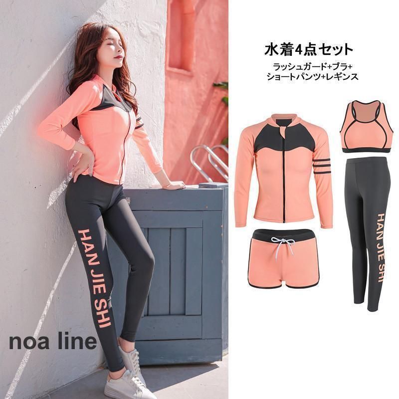レディース 水着 4点セット ウェットスーツ 新商品 スポーティ サーフィン 長袖 ラッシュガード 日焼け防止 30代 黒 イー デザイン豊富 40代 50代