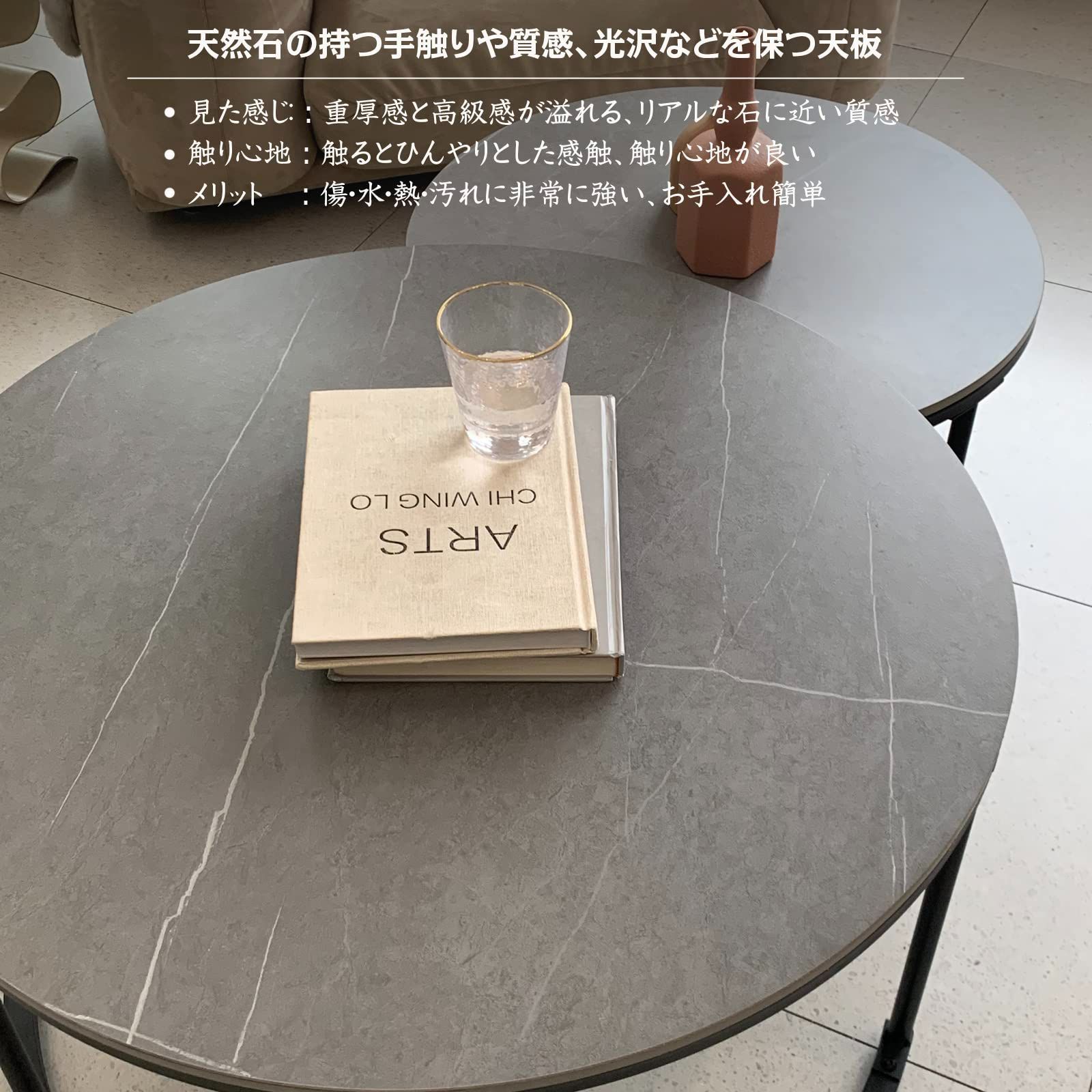 【サイズ】大テーブル:幅80x奥行80x高さ45cm 小テーブル:幅60x奥行60x高さ40cm 【素材】天板:焼結石 脚:スチール【重量】大テーブル+小テーブル:約24.8kg【耐荷重】大テーブル:約50kg、小テーブル:約25kg【天板の厚さ】約10.7㎜