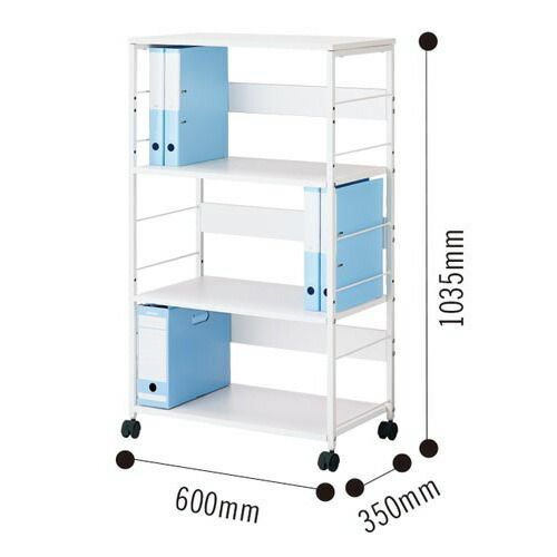 ●種別/デスクサイドハイタイプ●カラー/ホワイト●外寸法/幅600×奥行350×高さ1035mm●天板厚さ/15mm●棚板寸法/幅564×奥行350×厚さ15mm●内寸法/幅564×奥行330×高さ上・中段317、下段270mm●材質/フレーム:スチール(粉体塗装)、棚板:メラミン化粧板(MDF)、キャスター:PP●質量/13kg●耐荷重/棚1段あたり:約10kg、天板:約10kg●棚板枚数/可動棚板:2枚(46mmピッチ・2段階)●機能/キャスターストッパー機能(2個)