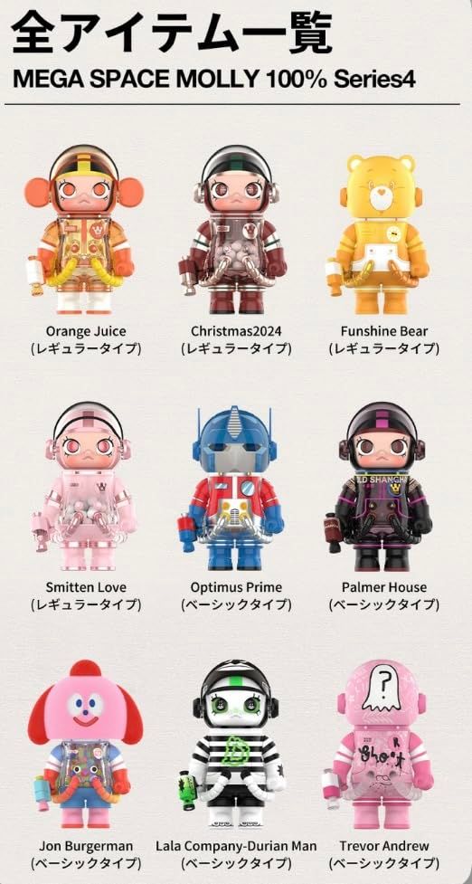 MEGASPACEMOLLY100%Series4ベーシックタイプ、レギュラータイ プ、マルチカラータイプ、シークレットタイプの合計15種のデザインが 含まれています。本セットには、ベーシックタイプのデザイン5種、レギ ュラータイプのランダムデザイン3種、そしてマルチカラータイプのラ ンダムデザイン1種の、合計9種のフィギュアが入っています。シークレ ットタイプが出現した場合、いずれかのデザインとランダムで入れ替わ ります。 ベーシックタイプの出現確 率:1/9;レギュラータイプの 出現確率:1/12、マルチカラ ータイプの出現確率:1/36、 シークレットタイプーの出 現確率:1/108、シークレッ トタイプー2の出現確率:1/108。 ブラインドボックスはすべて 中身が見えない個別包装とな っているため、開封するまで 誰もその中身は分かりません。
