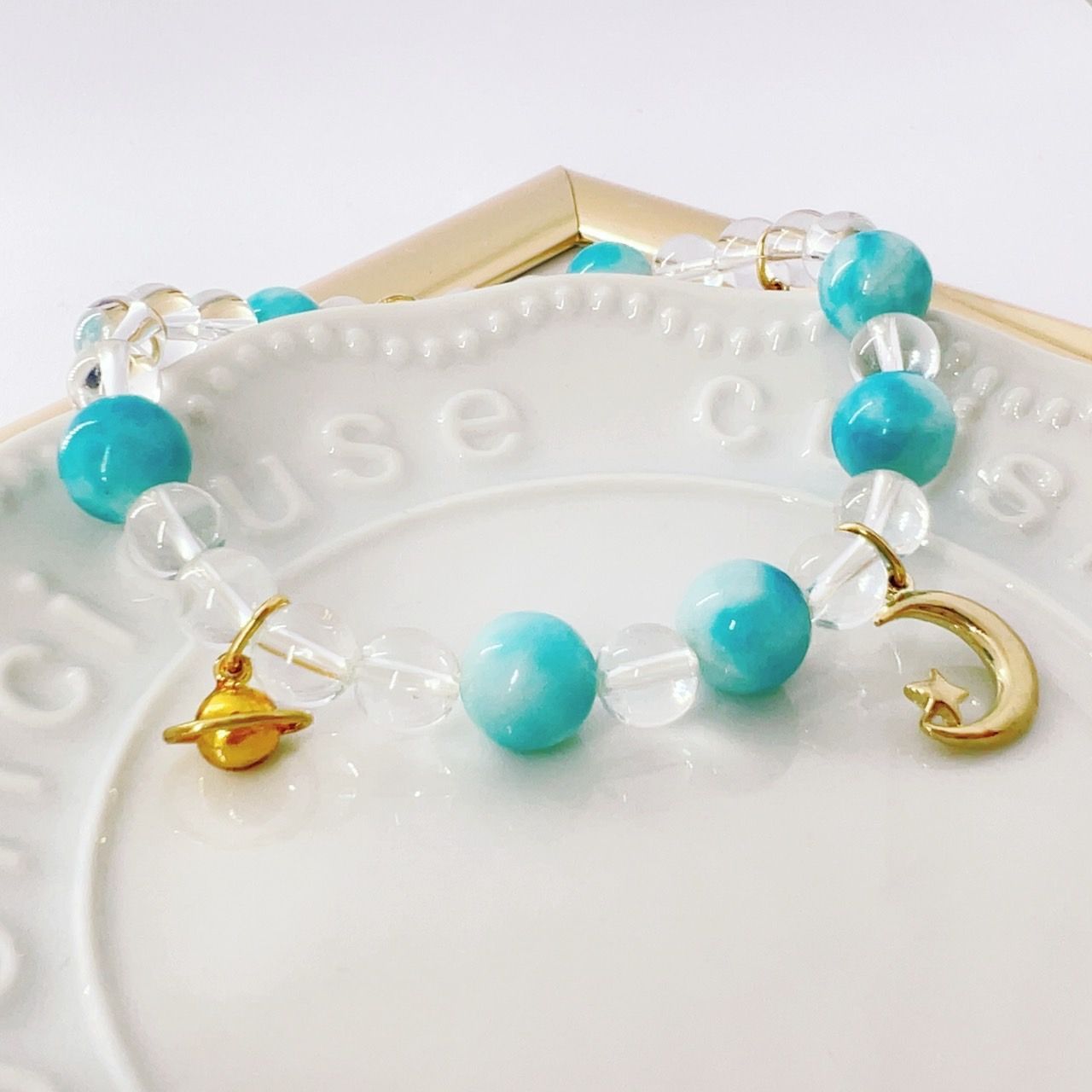 美しいクリスタルとカリブ海のようなblueが鮮やかなラリマーを組み合わせ、月と土星・海王星のチャームが揺れるブレスレットです。