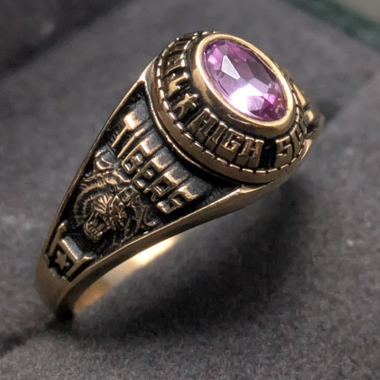 淡いパープルピンクのストーンがきらりと輝く、1999年のハイスクール・クラスリングです。
