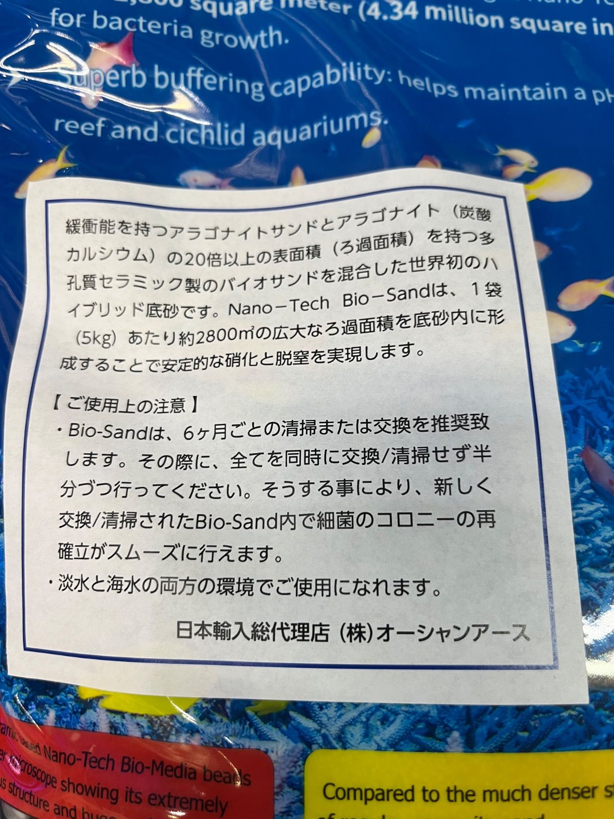Nano-Tech Bio-Sand は、優れた緩衝能を持つアラゴナイトサンドとアラゴナイトの20倍以上の表面積(ろ過面積)を持つ超多孔質セラミック製のバイオサンドを混合した世界初の機能性底砂です。