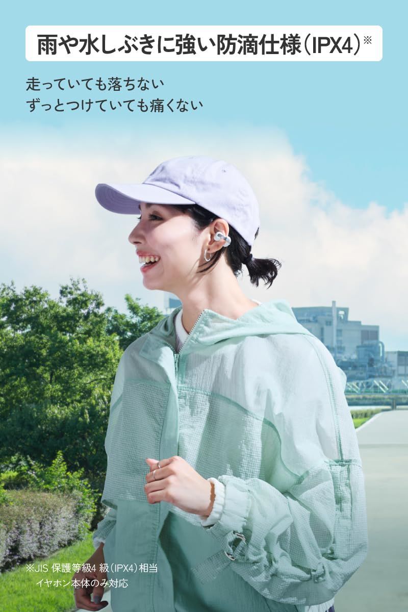 【雨や水しぶきに強い防滴仕様(IPX4)※】 日常生活の中での様々なシーン、天候急変時やエクササイズやジョギング、移動中など、雨や水しぶきが飛んでも使用可能なIPX4相当の防滴仕様を備えています。※JIS 保護等級4 級(IPX4)相当。イヤホン本体のみ対応。