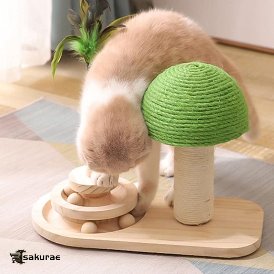 ..【絶妙なデザイン】:キノコ型の猫のおもちゃのターンテーブルは猫の頭の形で設計されており、スクラッチポストはキノコの形で設計されています猫のターンテーブルの各層には2つの木製のボールがあり、回転させて猫の注意を引ことができますこれは非常にプレイしやす、インタラクティブです