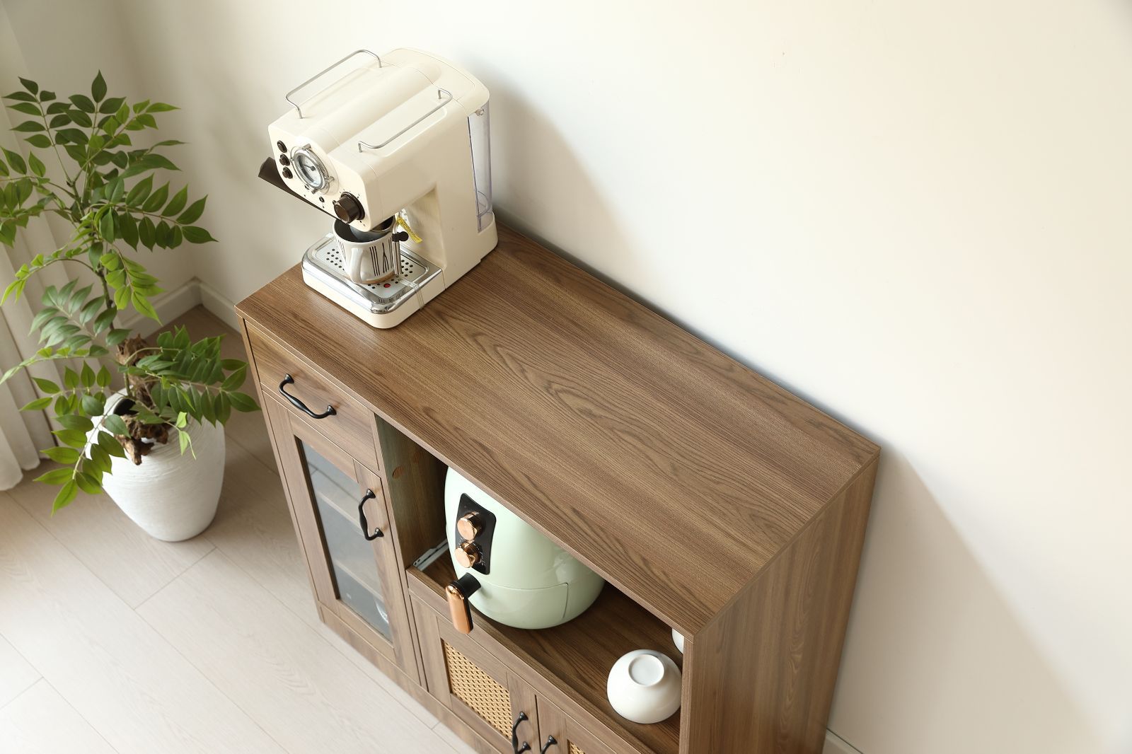 x キッチンカウンター 食器棚 キッチンキャビネット レンジ台 キッチン収納 幅88 cm ラタン調 引き出し付き 組立品 扉付き スライドレール ロータイプ キッチンラック レンジボード 収納 ガラス コンパクト BROWN