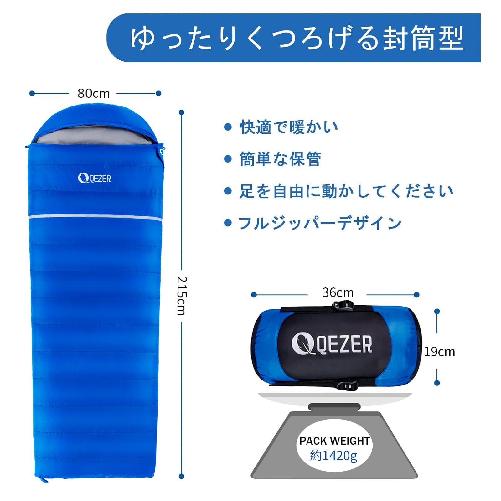 【超軽量・コンパクト】使用サイズ:215cm x 80cm、収納サイズ:36cm x 19cm(専用収納袋)、重量:1420 g。ポリエステル綿の寝袋の約半分の重さと体積で、持ち運びや保管が簡単な超コンパクトです、内ポケットには、鍵、時計、携帯電話、その他の小物を入れることもできます。収納の際は、寝袋の中の空気を十分に排出してから、丸めて収納袋に押し込めば、収納袋の留め具を調整して上下を圧縮すると、コンパクトに収納できます。