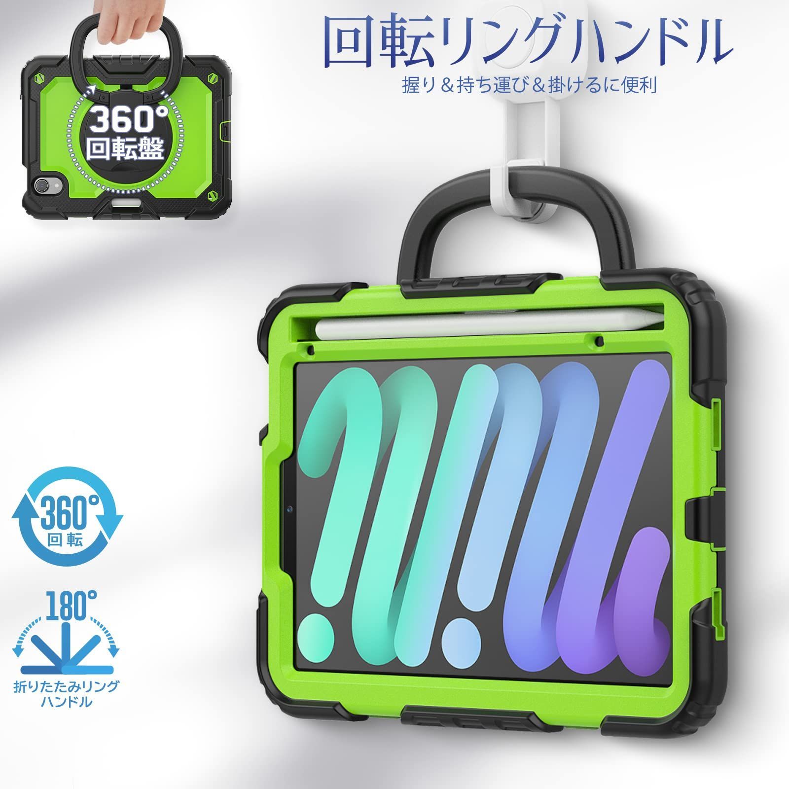 ★【360度回転リングハンドル】:どの場所、状況でも使いやすいリングハンドルは遊び、旅行中などに両手が自由になります。子供にもiPad miniが気楽に楽しめます。