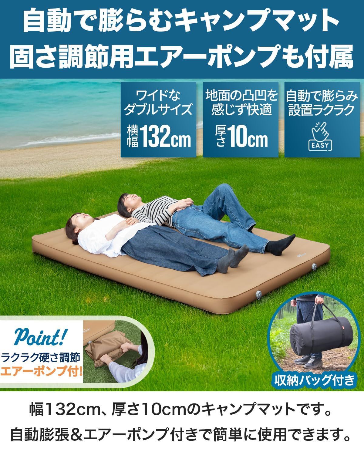 ✅【自動膨張式&エアーポンプ】キャンプマットのセッティングは二つのバルブを開放にするだけで自然に膨らみ簡単。また、エアーポンプ付きで空気の追加もラクラク!✅【幅132cmのダブルサイズ】このマットは幅132cmのワイド設計で、 大人2名がゆったり使えます。複数のマットを連結せず、これ一つで快適に使用可能です。