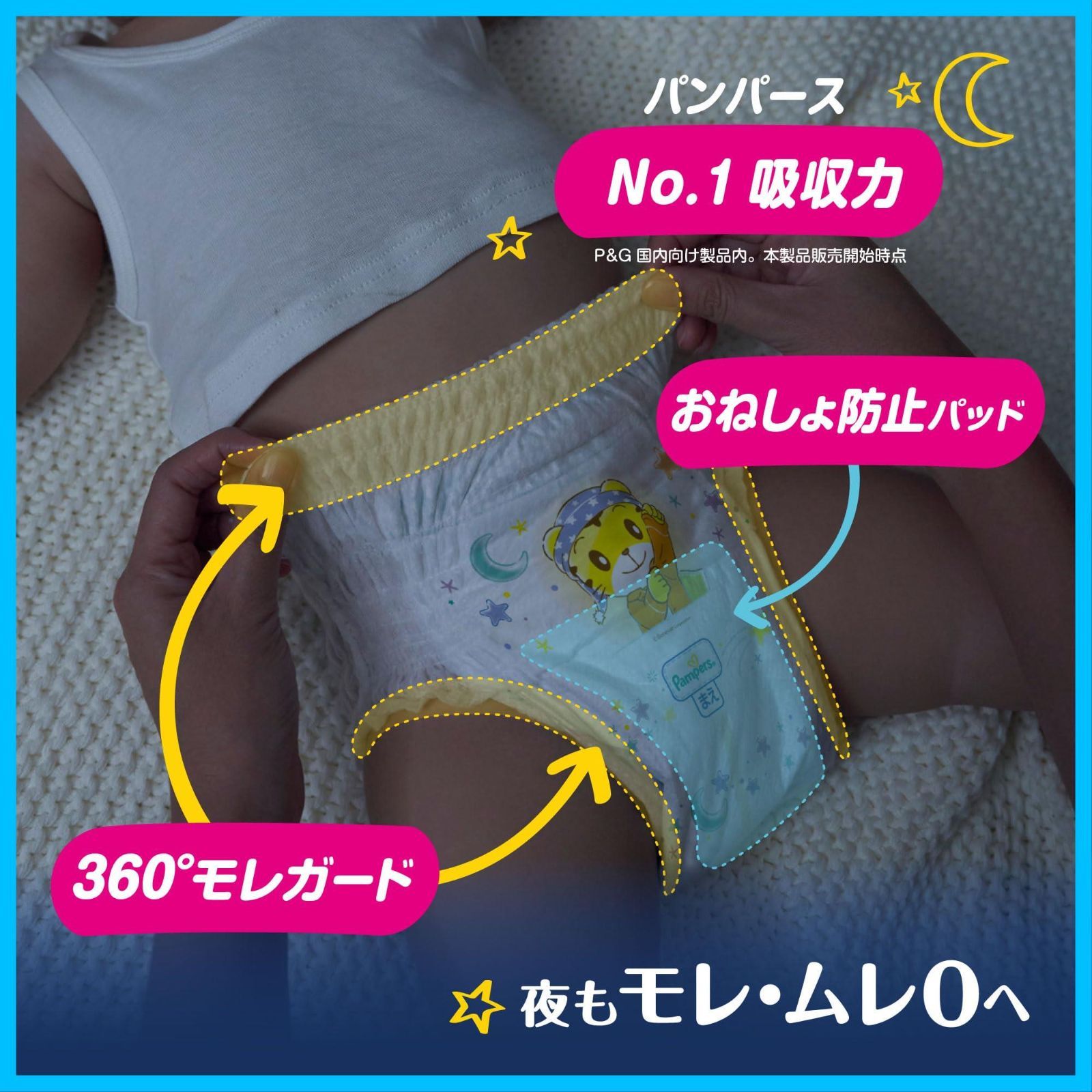 【パンパース おやすみパンツ おねしょ防止パッド新採用!】夜は昼の10倍モレやすい*。おねしょ防止パッドを搭載し、一晩中のおしっこを受け止めます。夜もモレ・ムレ安心。 * P&G調べ(Lサイズ N=115)