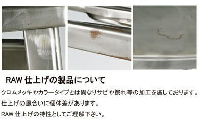 クロムメッキやカラータイプとは異なり、サビや擦れ等の加工を施しております。仕上げの風合いにも個体差があります。Raw仕上げの特性としてご理解下さい。
