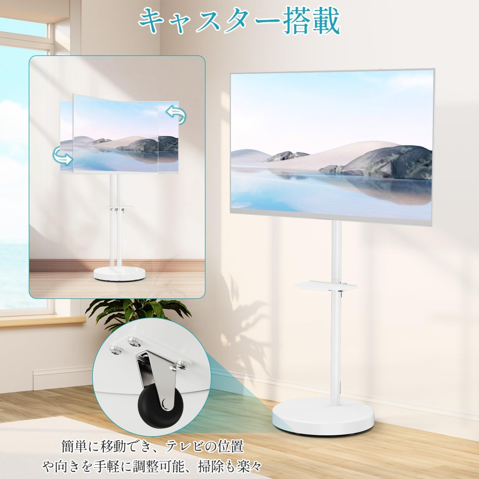 MOUNTUP テレビスタンド 中大型 55インチ対応 白 キャスター付き tvスタンド 移動式 耐荷重35KG テレビ台 床置き 壁寄せ VESA規格100~400mm 360°回転 丸型 家用 業務用 会社用 ホワイト MU1109W-07